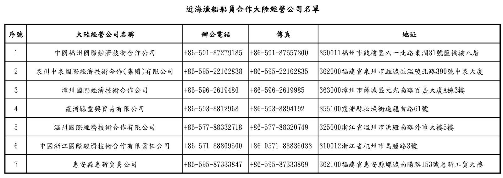 近海勞務合作名單-經核准可從事兩岸近海漁船船員合作大陸經營公司名單