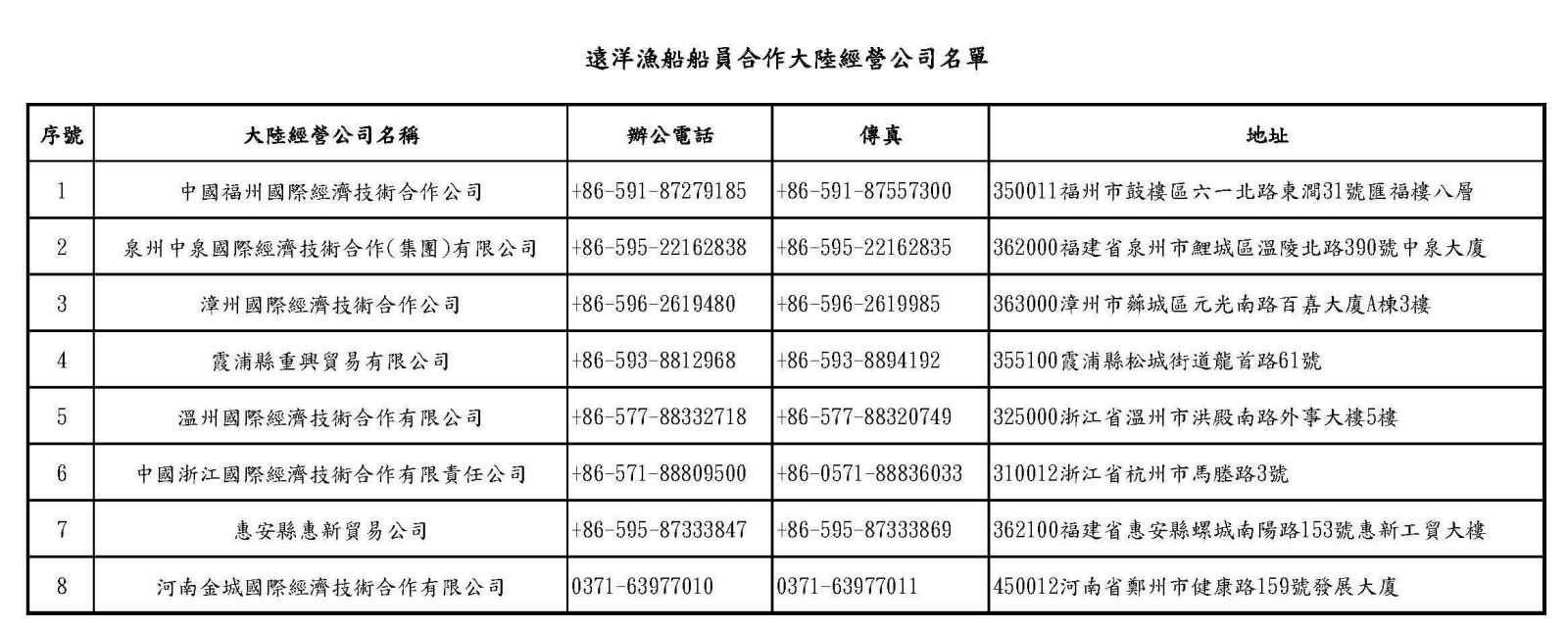 遠洋勞務合作名單-經核准可從事兩岸遠洋漁船船員勞務合作大陸經營公司名單